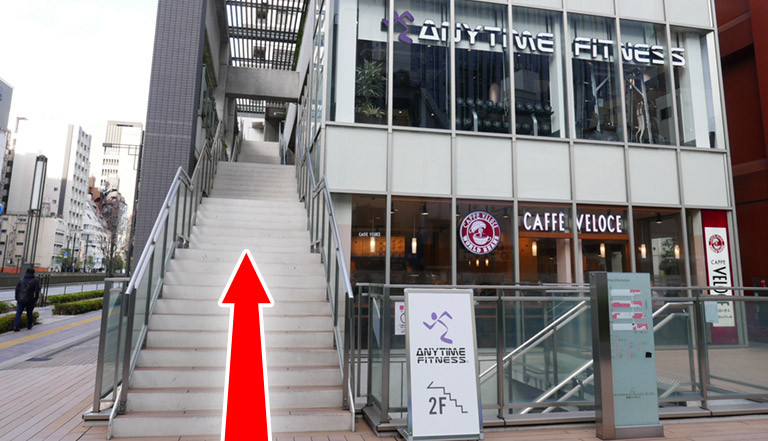 When you get through the road.You’ll find Shimbashi Plaza Building.Go up stairs outside to the second floor.